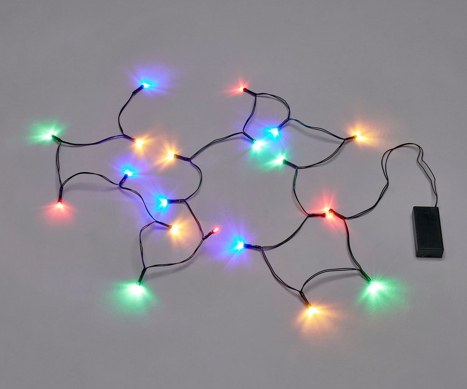 Enjoy the radiant multi color glow and festive flair that these lights bring, as they light up your home with the vibrant spirit of the holiday season. These lights can be intertwined with your Christmas tree branches, lending a vibrant and fresh touch to your tree, or simply adorn your fireplace mantel with a string of these lights to create a warm and welcoming focal point in your living room. 18 pieces in a displayer (9.2x5.2x6.6) at no charge. Requires 2 AA batteries. PP, Wire, Metal.