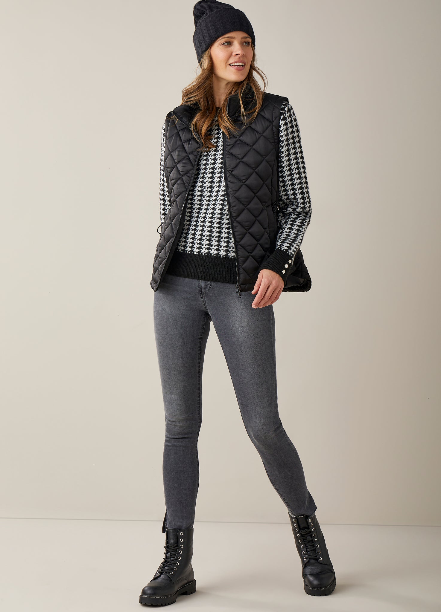 Lightweight layer able quilted, zip front mock neck vest, adjustable bungee elastic waist, welt pockets and high low curved shirt tail hemline in an easy fit hip length silhouette. Available in Camel, Black. Shell: 100% Polyester, Lining: 100% Polyester, Padding: 100% Polyester.