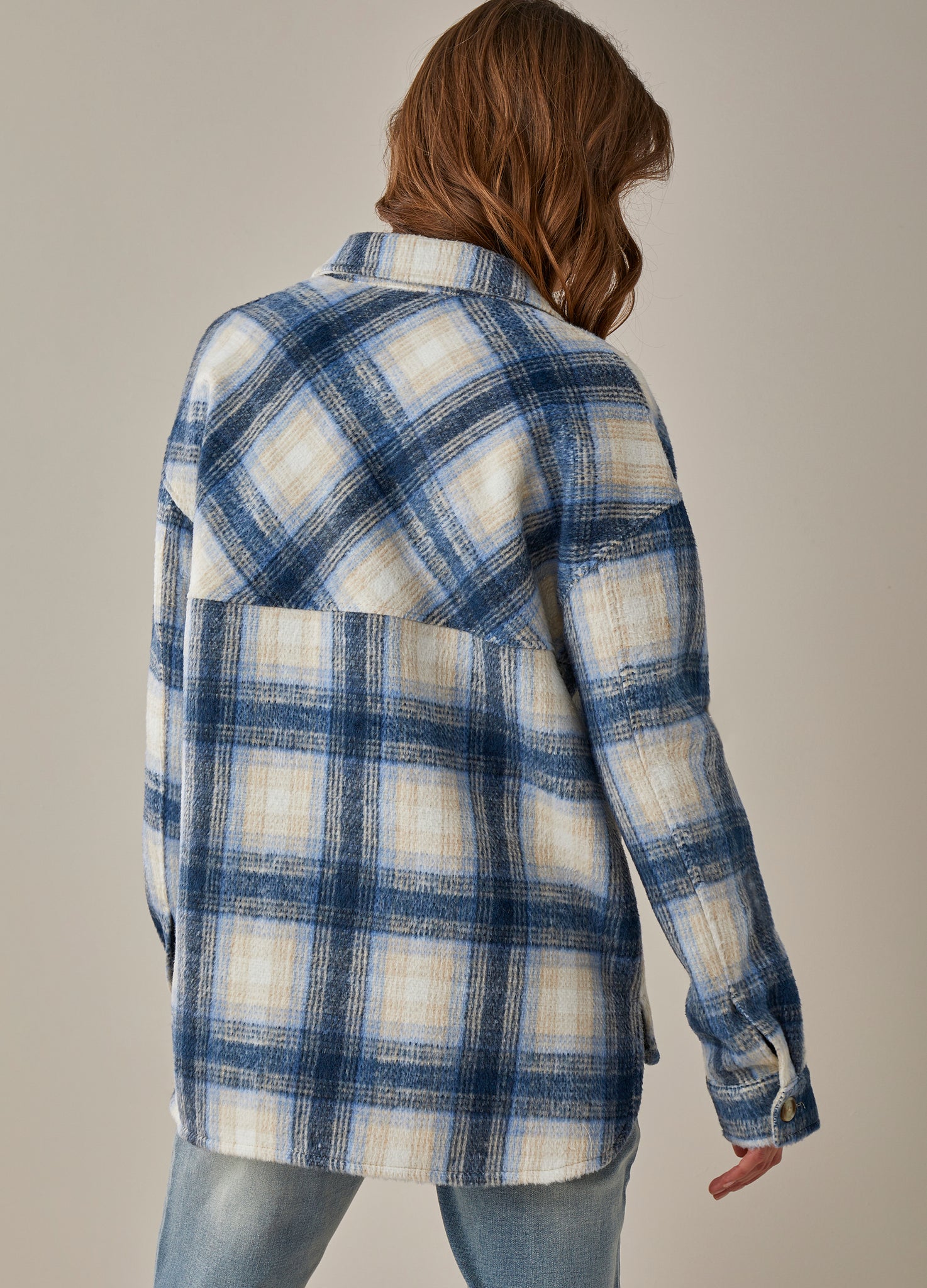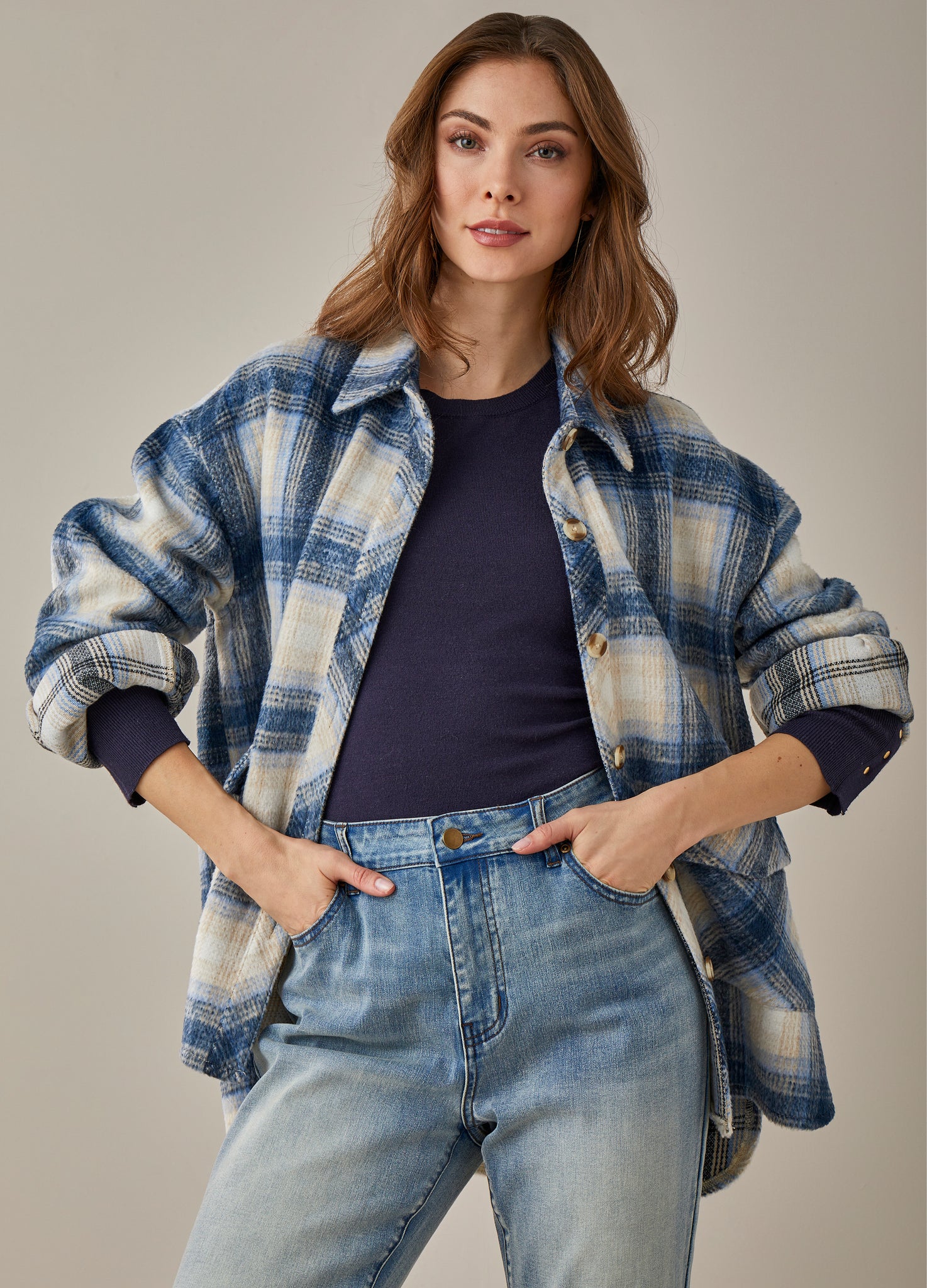 An oversize cropped hip length collared shacket in a structured fit, clean classic button front with long button cuffed sleeves, large patch pockets, shirt tail hemline in a high low length all in a beautiful soft brushed plaid fabric. Available in Blue Plaid. 100% Polyester.