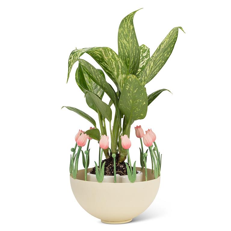 This small, shallow metal basket is adorned with pale pink tulips sprouting from the rim. Finely crafted from metal, these flowers will bloom year-round. Fill with a few bunny figurines and you’ll have an Easter Basket to envy