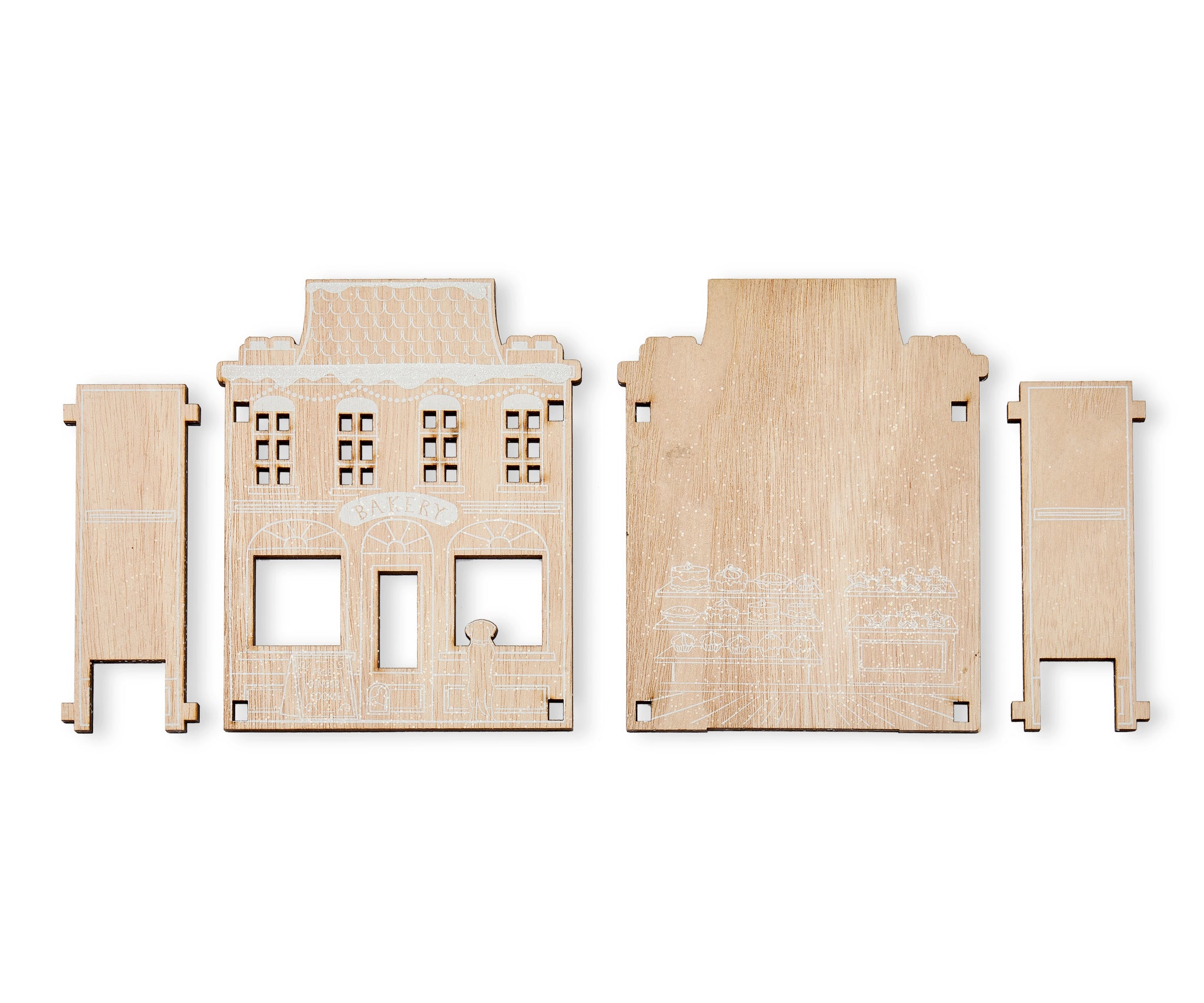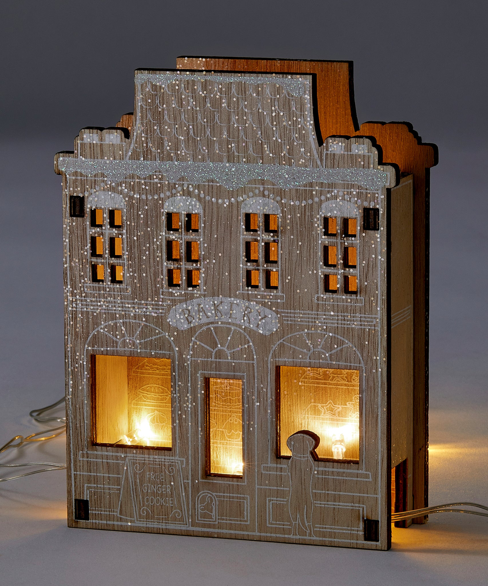 Start a new family tradition and bring the spirit of the holidays home by creating your very own Winterville! Easy to put together, this decor features a light wood bakery storefront with white motifs, silverglitter detailing, sentiment FREE GINGER COOKIE, and delicate engraving on the inside to really bring it to life. Light it up with string lights for a warm seasonal glow. Plywood.