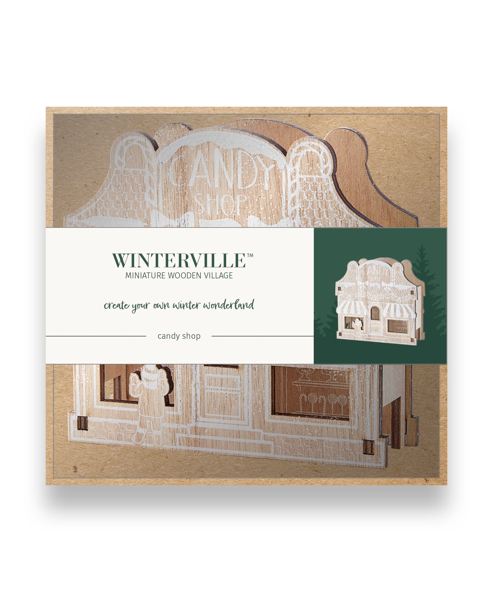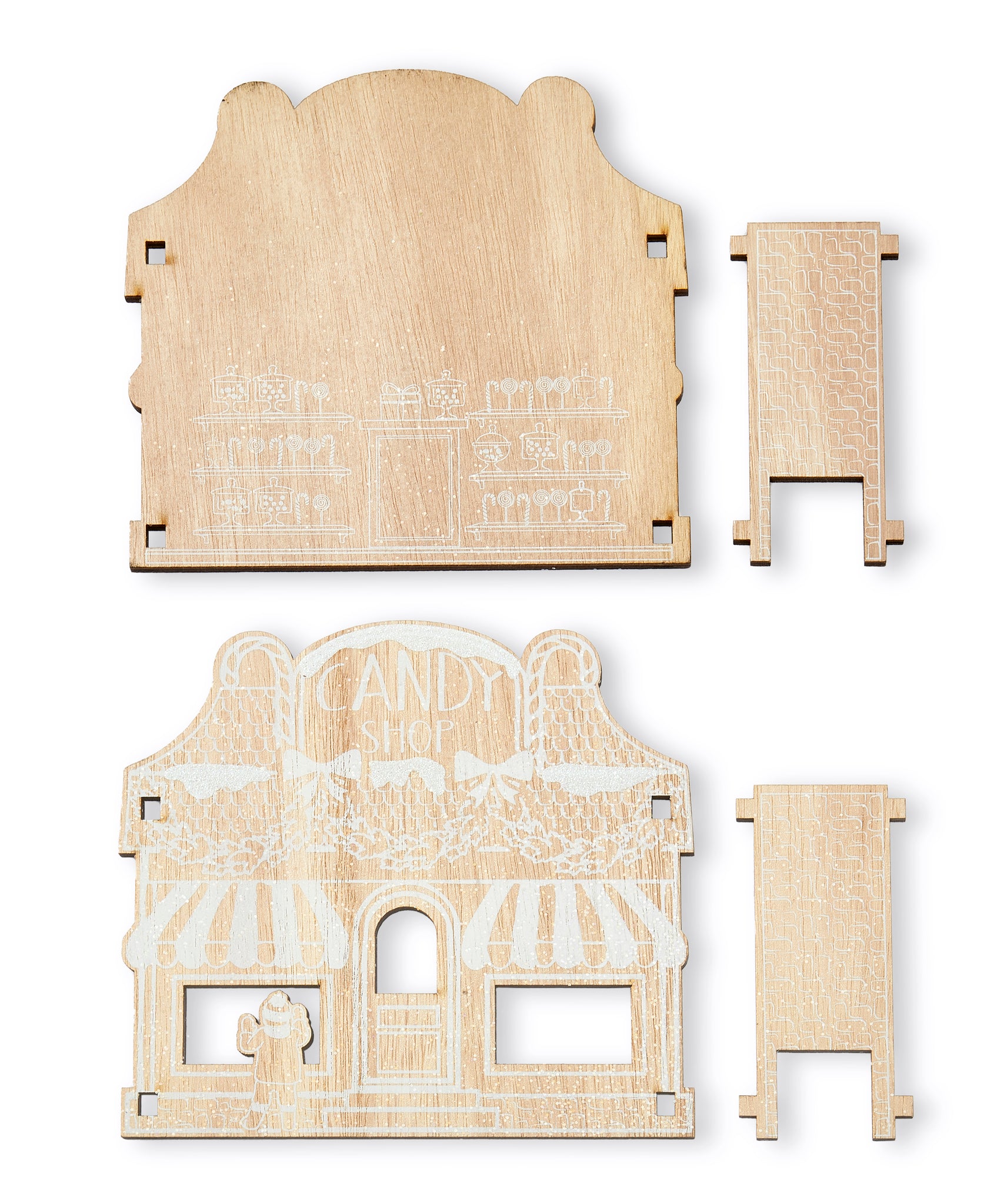Get little ones involved in creating their very own Winterville for some festive fun! Easy to put together, this sweet wood candy shop décor features an adorable light wood design with white motifs, silver glitter and gold sequin detailing, sentiment CANDY SHOP, and engraving on the inside to bring it to life. Light it up with string lights for a warm glow. Plywood.