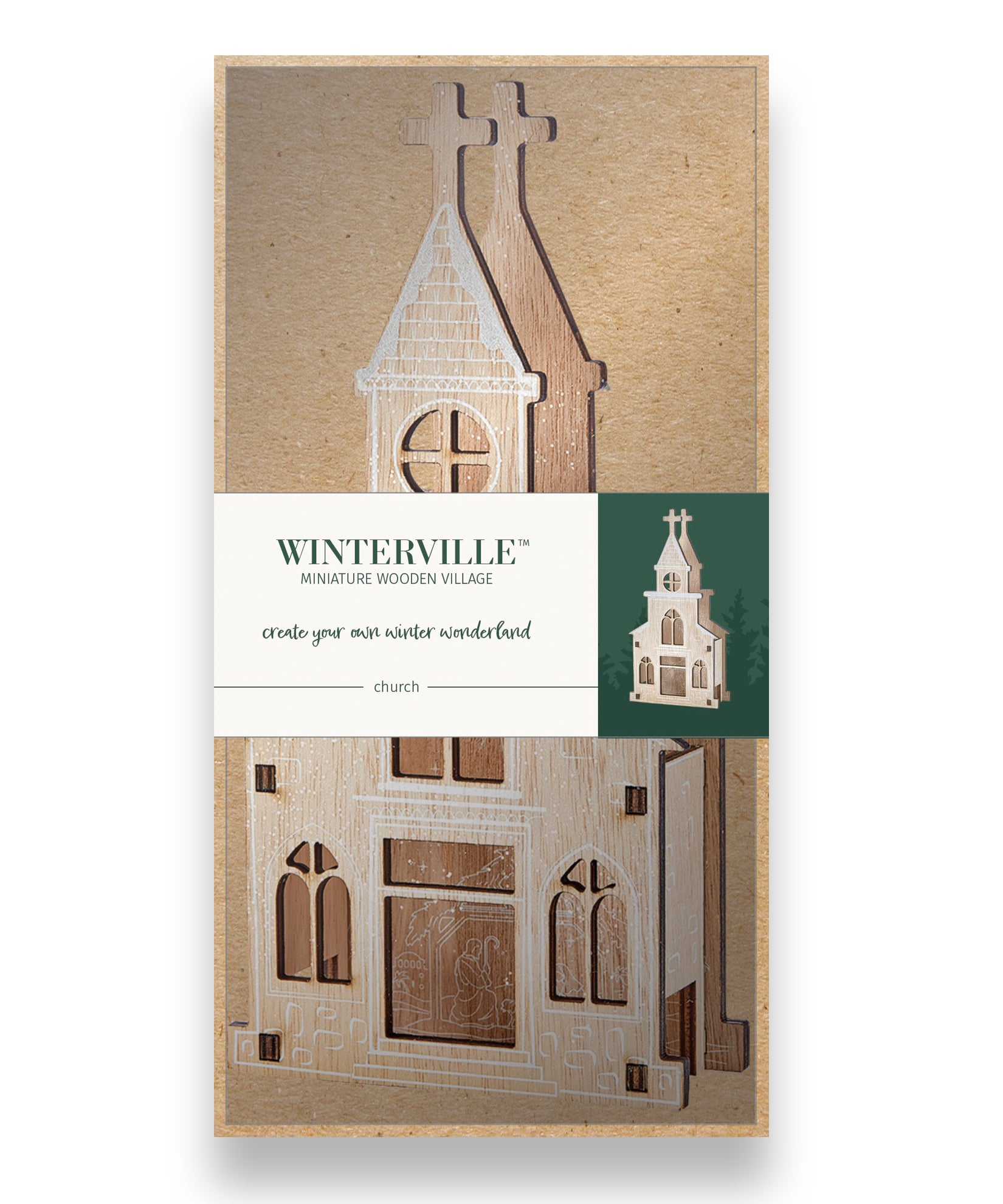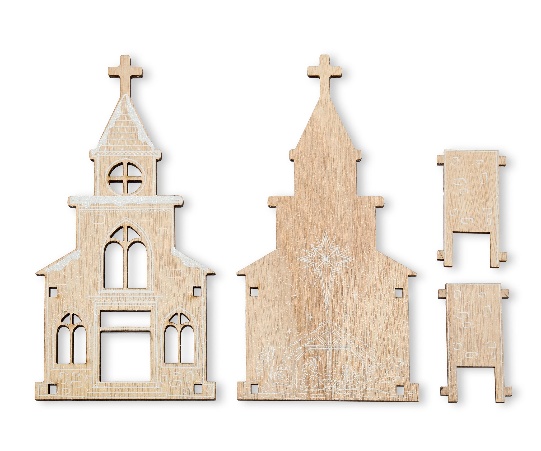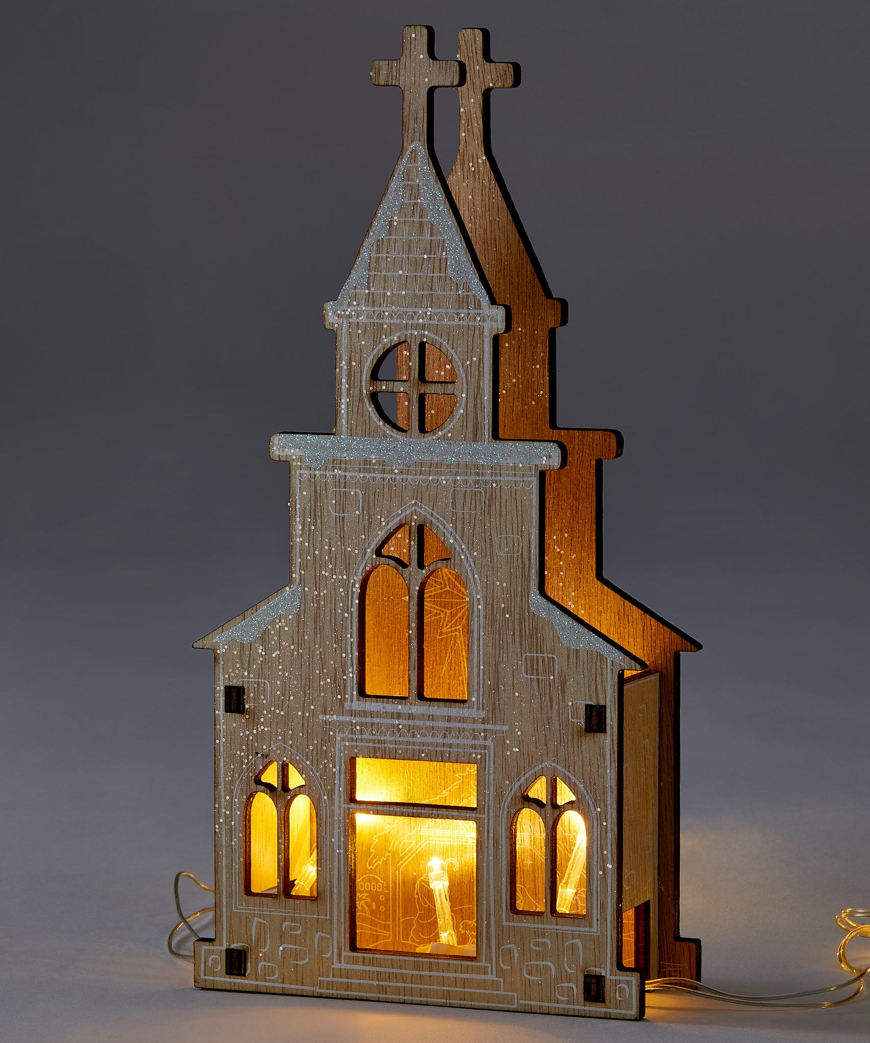 Start a new holiday tradition by creating your very own Winterville! Easy to put together, this festively charming décor features an intricately designed light wood church with white motifs, silver glitter detailing, and delicate engraving on the inside to really bring it to life. Light it up with string lights for a warm seasonal glow. Plywood.