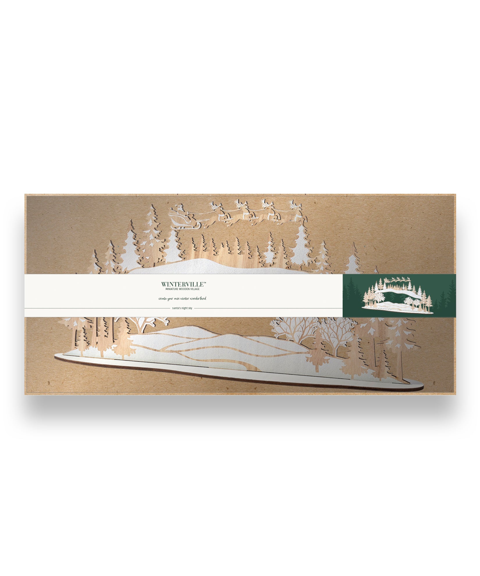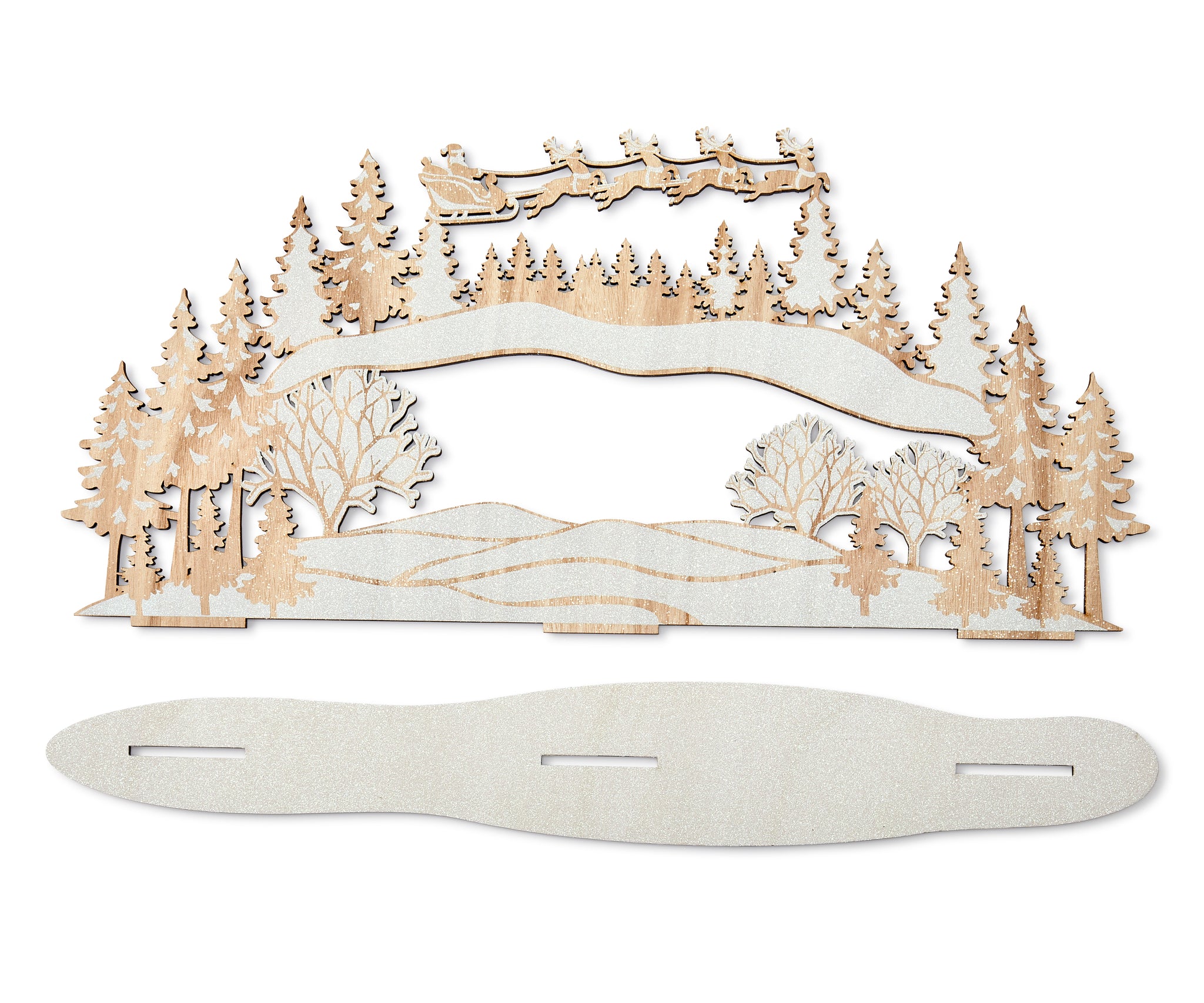 The most classical of Christmas scenes, this enchanting Flying Santa Sleigh Wood Décor will bring to life the magic of this jolly season. This creative wood décor is easy to put together and features a snowy base with Santa in his sleigh with reindeers flying across the night sky. With delicate white engravings and glitter details, this piece will add an instant touch of winter wonderland to your mantel or shelves. Plywood.