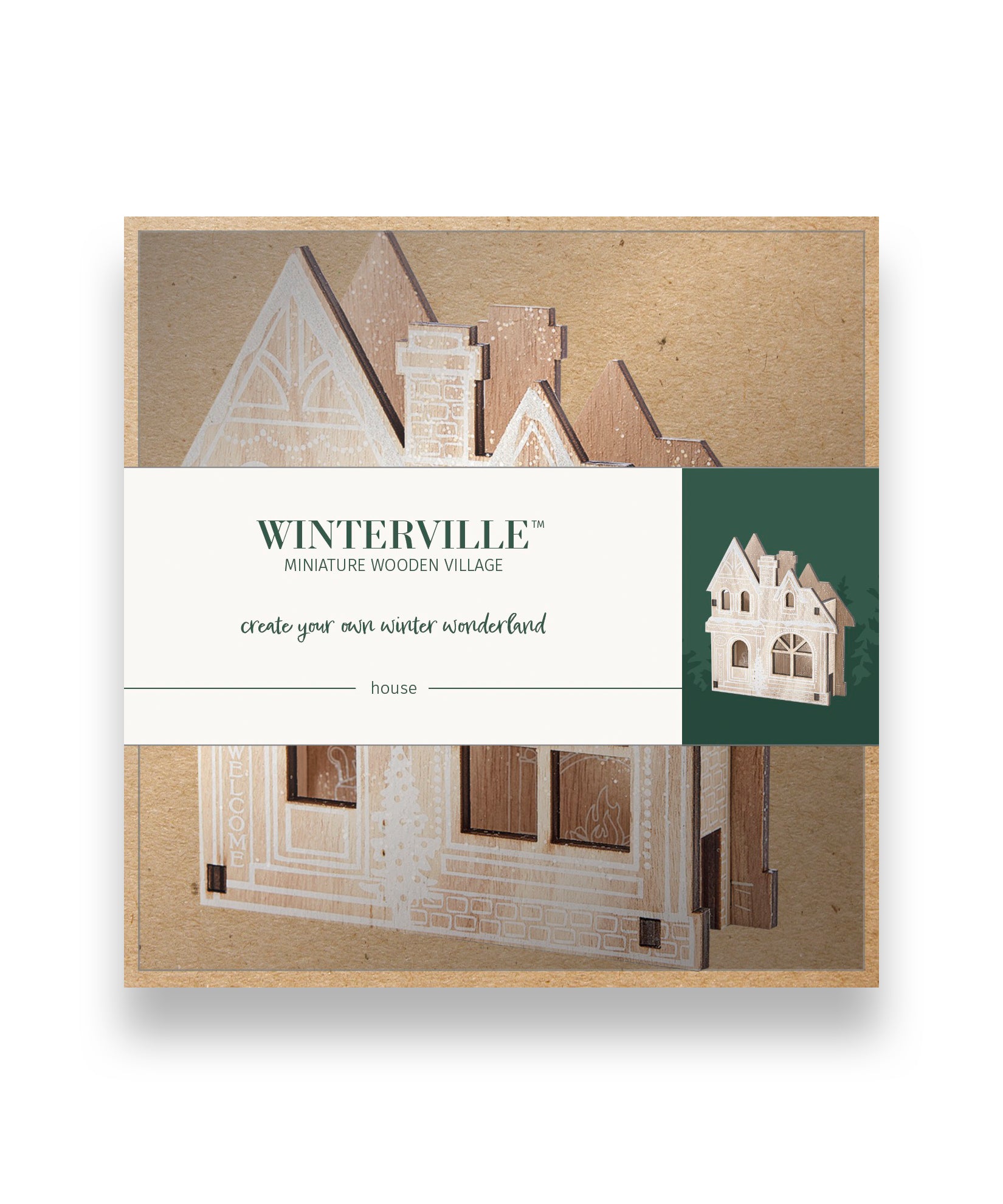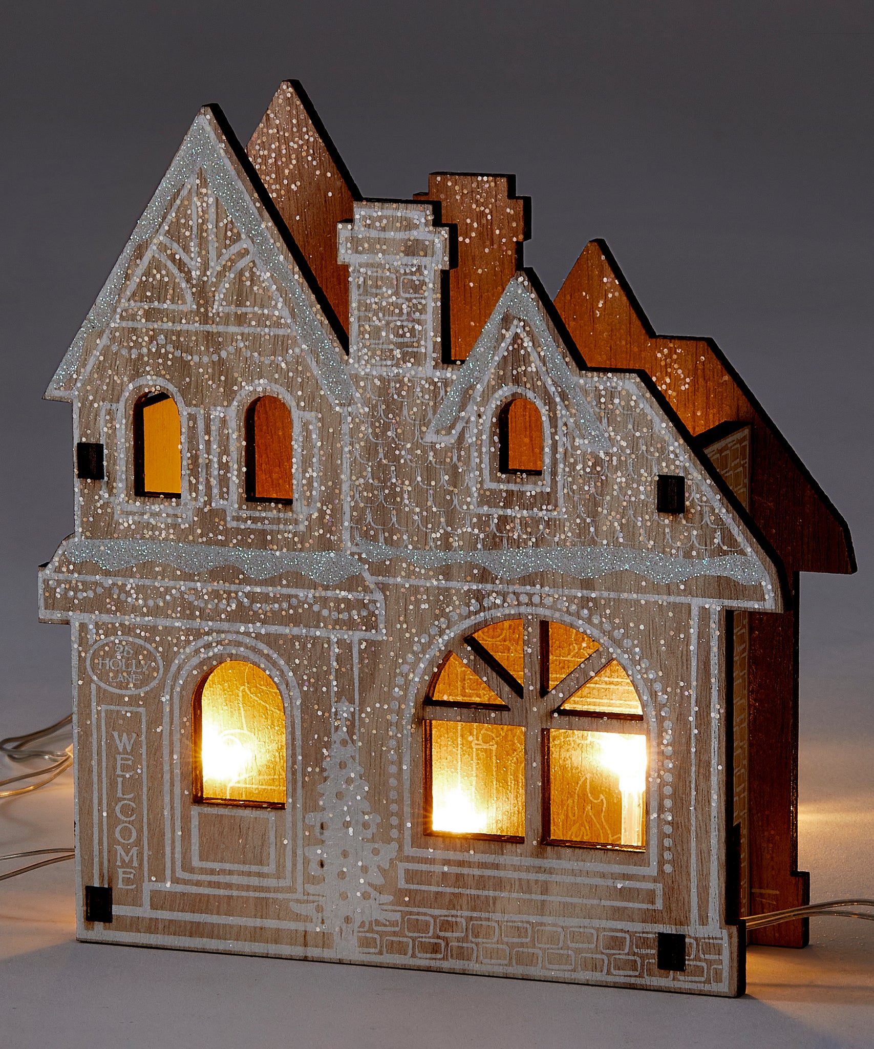 Welcome to 25 HOLLY LANE! Thanks to this Winterville Wood House decor you can create your very own snow village wonderland this holiday season. Easy to put together, this festive décor features a charming light wood house design with white motifs, silver glitter detailing, sentiment WELCOME, and delicate engraving on the inside to really bring it to life. Light it up with string lights for a warm seasonal glow. Plywood.