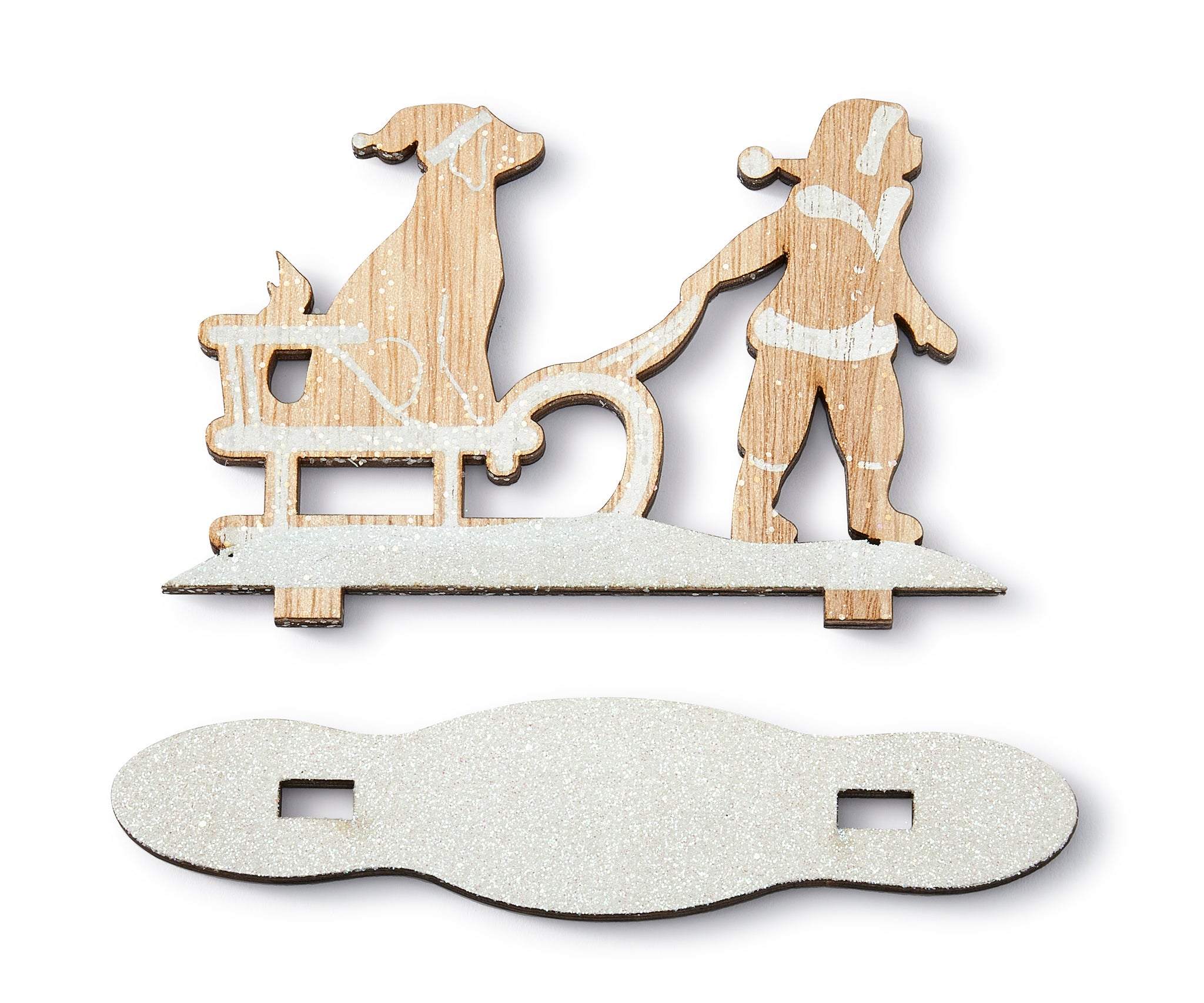 Add a playful element to holiday décor and decorate mantel or table top with an extra touch of wintry wonder with this charming Kid Pulling Sled wood piece. Featuring a shimmering white wood base and a sculpted figurine of a kid pulling a sled with a dog dressed in a Christmas hat, this décor piece will be a favorite year after year. Plywood