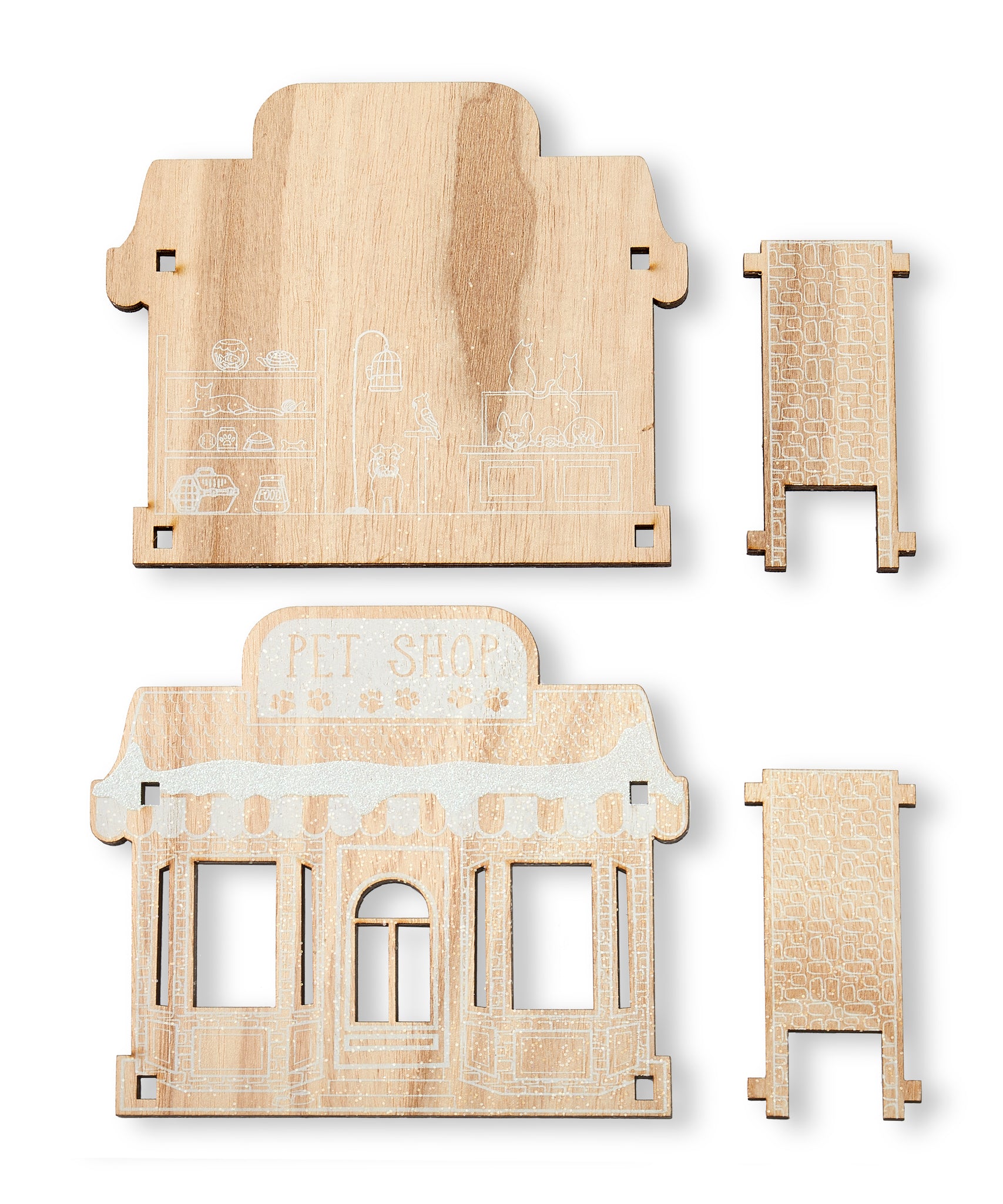 Bring the spirit of the holidays home by creating your very own Winterville! Easy to put together, this adorable pet shop décor will be a hit with little ones who want to include their furry friends in the fun. Featuring a light wood design with white motifs, silver glitter and gold sequin detailing, sentiment PET SHOP, and engraving on the inside to bring it to life. Light it up with string lights for a warm glow. Plywood.