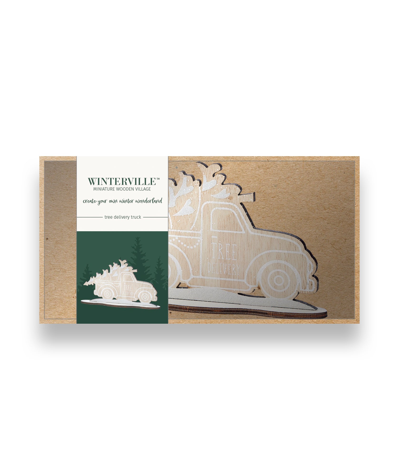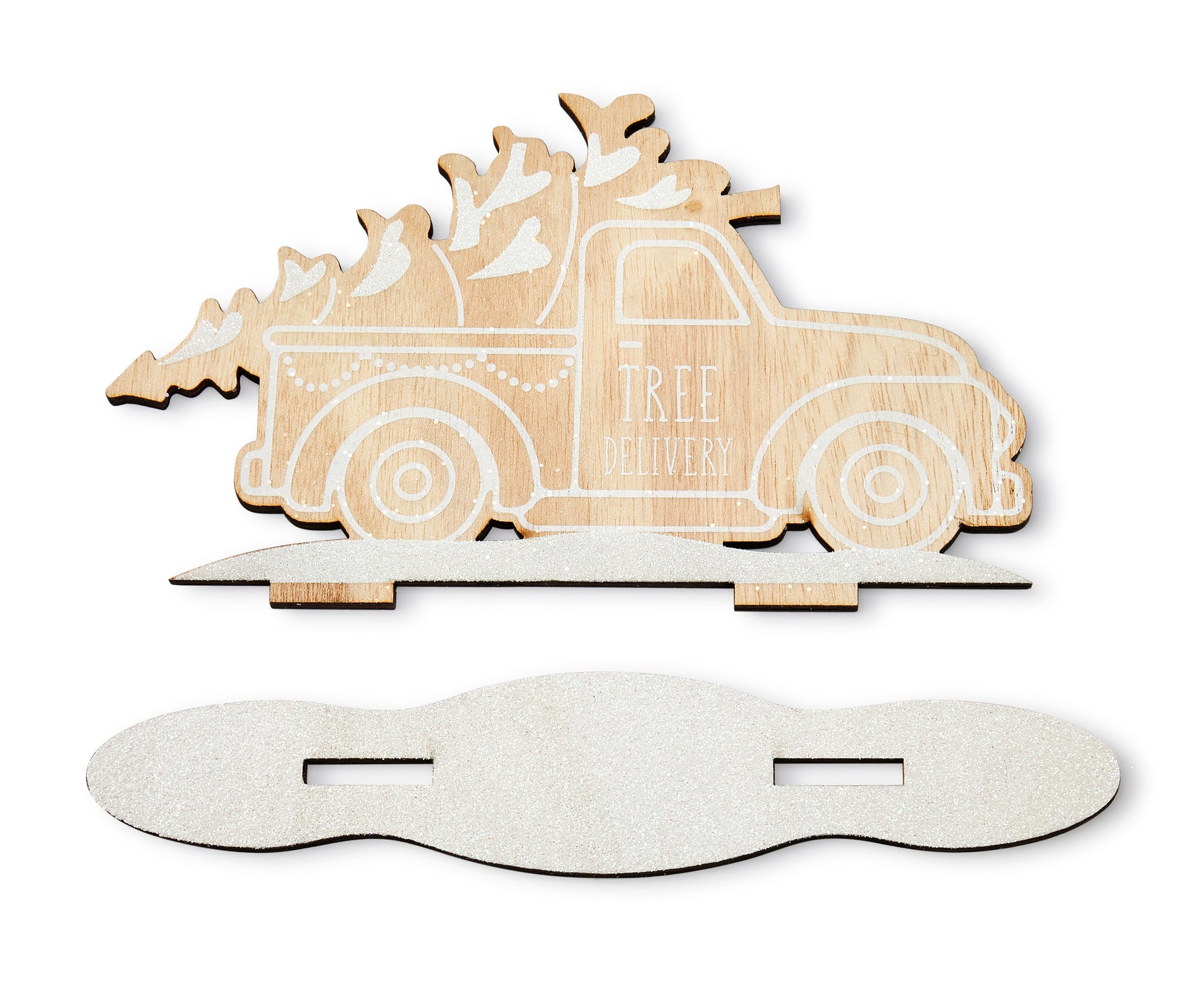 Elevate your home décor with new festive accents like this Christmas Tree Delivery Truck this holiday season. Featuring a pickup truck with a Christmas tree in the back and sentiment TREE DELIVERY, this wood décor piece will add a touch of winter wonderland with its glittery white detailing. Plywood.